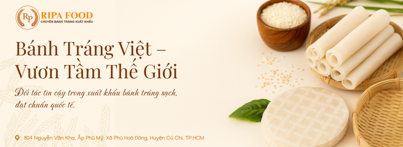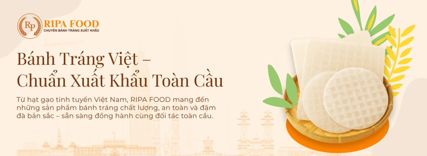 Bánh tráng là một trong những biểu tượng đặc trưng của ẩm thực Việt Nam. Từ những chiếc bánh mỏng, dẻo và thơm mùi gạo quê, ngày nay sản phẩm này đã trở thành mặt hàng được nhiều quốc gia yêu thích và tiêu thụ mạnh. CÔNG TY TNHH RIPA tự hào là đơn vị chuyên sản xuất – chế biến – xuất khẩu bánh tráng chất lượng cao, mang hương vị Việt đến với thế giới.
